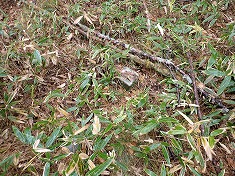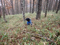 西南西に進んでゆくとカラマツに角スコップが立てかけられており、それには「馬糞取り」とテープに書かれていた。何のために置いたのか不明だが、前回下見の時には無かったものであった。この道を進んでゆくと、サッカー場の西端で南に進みだす。目的地は北にあり、離れて行く格好になるので適当な場所から西に入る。10頭以上居ただろうか、鹿の一団が警戒音を発しながら西へと駆けて行った。彼らの鹿道があちこちにあり、笹に埋もれるように細く存在していた。地形が広いので太く濃くはならないようだった。