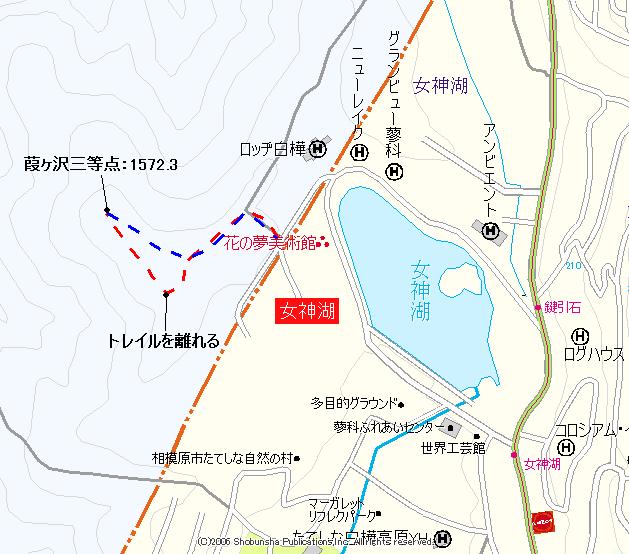 女神湖の西にこんもりとしたピークがある。そこに葭ヶ沢三等点が置かれている。以前に一度下見をしており、山腹には地形図に描かれない道があることも知った。この道は、おそらく旧の「中央分水嶺トレイル」の道で、現在のトレイルはサッカー場南の舗装路を通過させている。サッカー場の北側にもハッキリとした道が存在していたのだった。ここと、もう一つ長門牧場側の点を予定していた。