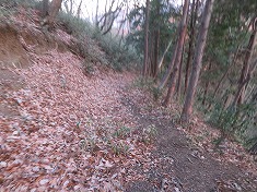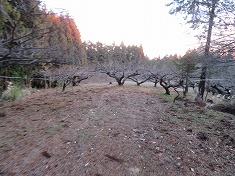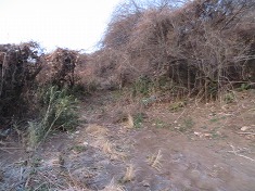 | @北東麓の小谷の右岸からスタート。 | 旧果樹畑への入口 | 果樹畑は荒廃し道形も藪化し、途中で北にズレる。 | 果樹園の北側に良く踏まれた道がある(地形図に掲載)。 |