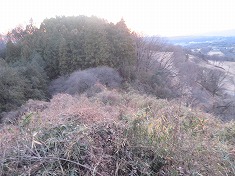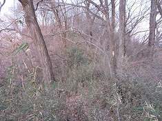 道形の終点からは踏み跡もない場所を分けて西に進んでゆく。小ピークが連続する鞍部が堀切で、東側には3か所堀切が在ったと記憶する。そして最後の堀切からは笹を掴みながら這い上がる様にして登って行く。観光地化された城址なら歩道が出来ていそうだが、ここはマイナーな場所なのでそれらは無い。