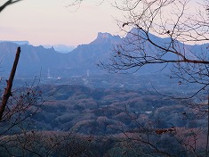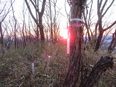 猪ノ毛山三等点峰登頂。国土地理院の杭が伴い、すぐに標石が目に入ってきた。字地名が猪ノ毛山だが、山名でいいのだろう。ちょうど東からの日の出があり、元日同様の雰囲気があった。南側眼下にゴルフ場が広がり、その遠く向こうに御荷鉾の山並みがあり、その間には遮るものがないので絵になっていた。妙義も、日頃見無い角度からなので新鮮だった。北側からは時折北陸新幹線の通過音が聞こえる。浅間山からは目視できたが、ここは車両は見られなかった。