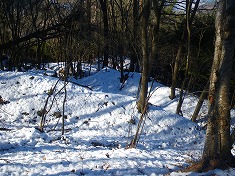 破線路の続く北西側に広い林道幅が降りて行っているので、このまま車道のような場所が続くのかと思ったが、すぐに山道となった。それも趣のある峠道の様相で、多くの人が歩いたから掘れたのか、歩き易くするために掘ったのかは不明だが、掘れた九十九折の道が延々と続くような場所であった。歩く人が少ないのだろう、落ち葉が堆積し、その上に積雪しているので、膝くらいまで埋まる場所も多い。恩若峯に続き、ここでもスパッツをしてきてよかったと思えた。