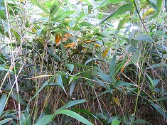 勾配は緩やかだが、掘れた水路のようになっている場所が多く、赤土であり滑る場所が多かった。その為であろう掘れた周囲が踏まれ登山道が広がっているようにも見える。蓬莱山のどてっとした山容が近くなってきてスカイラインからの音も大きくなってくる。登山は好きだが野草に触れられるのが嫌いという人がいるが、そんな人はここには入山できないルートであった。鳥子平側のルートもである。