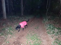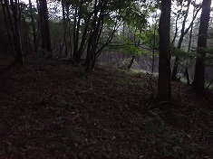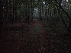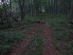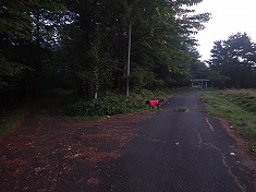 5:04行動開始。県道482号を東に進むと、トイレ舎の建つ場所がある。地形図には建物の記載はないが、そこを挟むように2本の破線路が北に入っている。東側の道は廃道のようで見えなかった。西の道は林道幅で奥に続いていた。南の牧草地には、牛ではなく鹿が群れを成していた。県道を離れ林道に入って行く。ここにゲートが在り入れないかと思ったが、それらしいものは無かった。点の記からは、この道の西側に牧場管理事務所があると描かれているが、現存はしていない。牧場内にいる雰囲気はなく、里山の丘陵を歩いている感じで心地いい。
