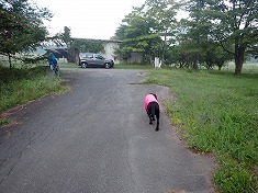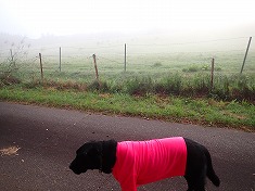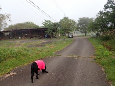 | 牧場らしい直線路を戻ってゆく。 | 朝霧の中に牛が牧草を食んでいる。 | F1254高点分岐に戻る。重機小屋あり。 |