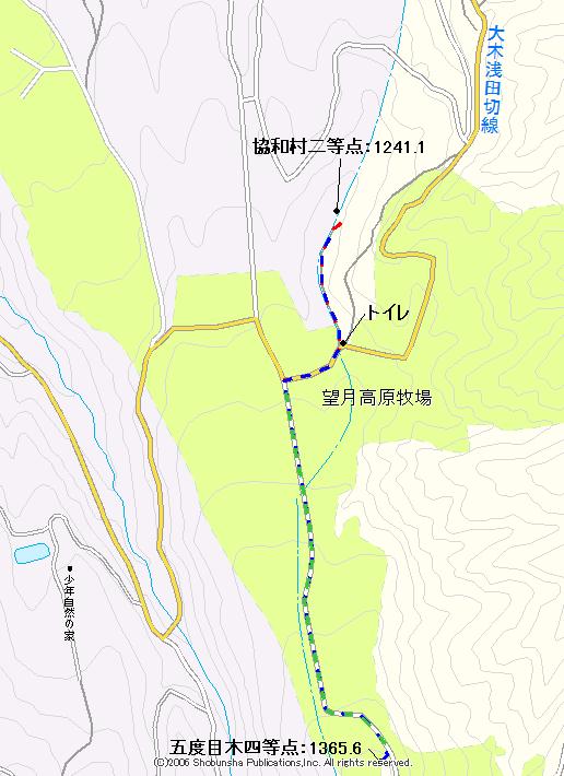 | @大木浅田切線、望月高原牧場内の分岐点。1254高点に駐車。 | 県道482号 | A西側の実線路には林道在り、ここを入る。この場所に牧場管理事務所があったよう。 | Aトイレのある側。こちらの実線路の場所は、道なし。 |