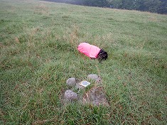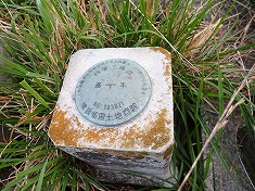 五度目木四等点到達。基部がしっかりとコンクリートで固められ防障石も置かれていた。ただし東側の一つが欠損していた。真鍮仕様ではあったが、これはこれで、この場所に似合っていた。この仕様だと、マニアに割られることがないのでいいかもしれない。ガスが無ければ展望のいい場所だろうが、まだ垂れ込めていた。長居はせずすぐに戻る。