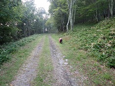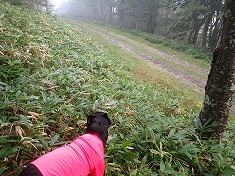 林道を進むと南西に斜上してゆく道形が見られる。現在は使われていない廃道状態で、びっちりと笹に覆われていた。そこを登って行くと牧場の縁に出合う。ここも昔は出入り口が在ったようで、門柱だったのか太い木が二本見られる。少し南に進むとフェンスの壊れた場所があり牧草地に入ることができた。菅平や美ヶ原などもそうだが、通常はフェンス際に牛の踏み跡ができるが、ここにはない。そもそもの糞がほぼ見られない。上部の牧草地は使っていないのか・・・それか牧草の成長度合いで使い分けているのかもしれない。