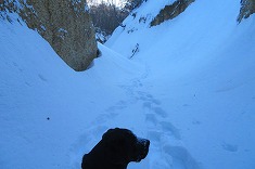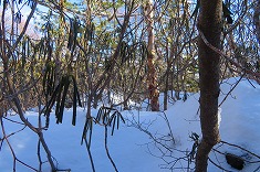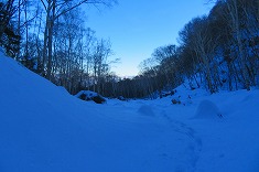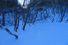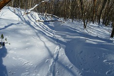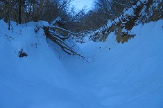 谷はどんどん狭くなり両岸が高くなる。そして進む先に滝のようなノドが現れた。高低差2.5mほど。ピッケルがあればアイゼンがあればと言う場所だが、利器はスノーシューとストックしかない。少し藻掻いてみたが無理。かなり藻掻き上がったとしても迷犬は無理であった。両岸は火砕流の堆積で、美的な印象を抱いた。敗退か・・・と戻って行く。ただしまだ時間は早い。諦めるのには早い。そもそも破線路は左岸にある。谷の中に道が無い訳が良く判った。ダケカンバの生える広みまで戻り左岸へと這い上がって行く。