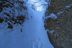 | 1445m付近。かなり峡谷な雰囲気に。 | C1470m付近で狭いノドが現れた。アイゼンで登るような急斜面。スノーシューでは越えられず撤退。 | C横の壁。火砕流の噴石が4〜5mほど堆積しているのが見える。 | C僅か2.5m程だが越えられず。幅350mmくらい。かなり狭くなっている。 |