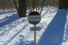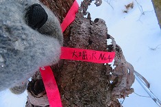 測候所の看板の場所まで戻ると、縛られたリボンに文字があるのが見えた。そこには「大堀沢」とあった。今伝った沢の名前がここで判った。溶岩樹型に注意しながら戻って行く。別荘地内は、マイカーが見えるお宅もあるが閑散としていた。出窓に二匹の猫が見えるお宅もあり、雪に閉ざされた中で静かに過ごしているようだった。駐車余地に戻る。