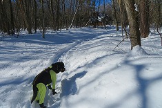 狭い道幅を進んでゆく。いつもなら斥候役の迷犬であるが、ツボ足が辛いのか後ろをついてきていた。省力する術を知っており頭がいいのかもしれない。樹林帯に入り適当に歩いてゆくと、深い溶岩樹型がありヒヤッとする。自分もそうだが、犬が落ちれば容易に上がることはできない。この白い地形の中にそれらが潜んでいるかと思うとゾッとした。どれほどあるのか判らぬが、判らないことに対するリスクが大きい。でもそのワクワク感が楽しかったりする。ストックを最長に延ばし、先を突くようにしながら進んでゆく。