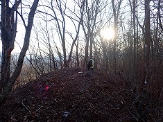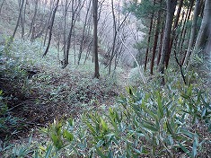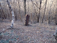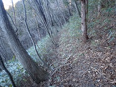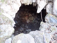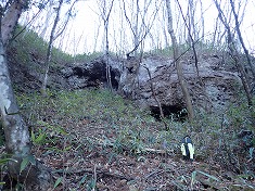 上の方は道形が判りづらかったが、1055m付近から深く大きく掘れた道形が現れた。進んでゆくと1015m付近に変則十字路が現れる。ここを西進してゆく。しばらく林道幅だったが、途中の1025m付近でその幅が無くなり、以西は山道の幅となった。獣道と言った方がいいほどに歩かれておらず、伝っている道は、地形図に描かれている破線路の場所とは違うようだった。道形を北に進むと、状態のいい炭焼き窯が現れた。石積みの崩れている場所はなく、すぐにでも使えそうな窯であった。それを右に見ながら進むと、今度は上に15mほど上がった場所に岩窓が見えた。横には岩屋も見られる。この時、かなり興味が湧き這い上がって行く。現地は勾配が強く、足場が緩く流れやすい。踏み跡などは無かった。