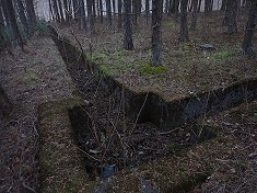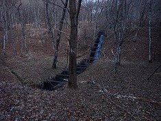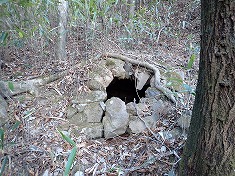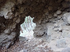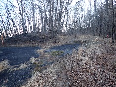 | 変則四差路を西に進む。降りてきたのは右側から | 1025m付近で、林道幅が消え山道に。 | 途中に状態のいい炭焼き窯がある。 | 炭焼き窯内部。綺麗な状態が保たれている。 |