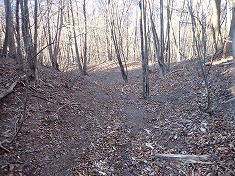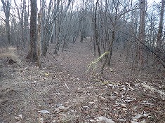 | D霧積中継所のアンテナが立つ。 | D南から見る山頂部。 | 1050m付近で広い道形が現れる。 | 1015m付近の変則四差路。 |