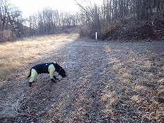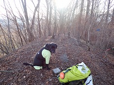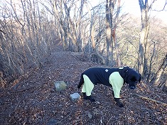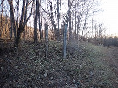 林道が尾根を乗越すのが1115m付近で、ここには巡視路標柱が立ち、42番と43番鉄塔を示していた。42番側へと東進してゆく。すると進路の先に大きな岩頭が現れる。岸壁には赤ペンキで何か書かれているが、判読できないほどに退色していた。林道幅はさらに続き、途中の麓側には、ドラム缶構造の檻が立てかけられていた。右に見ながら進むと送電線鉄塔下となり、そこからの斜面に2つの階段路が切られている。ただし管理されていないようで、霜でステップの杭が抜けてしまい使えない物の方が多かった。1140m付近で主尾根に乗り上げる。乗り上げた先には、志賀高原側の白き峰々が見える。振り返ると、裏妙義の岩峰が、面白い形で見ることができた。東に進んでゆく。