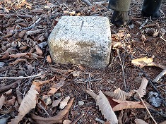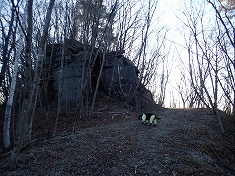 | 1075m付近の池 | 1115m付近。尾根を乗越して北側に林道が進む場所。ここに巡視路道標が立つ。 | 1120m付近の巨岩。帰路はこの上側に降りてきた。 | 巨岩壁に赤ペンキで何か書かれている。 |