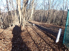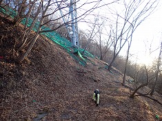 | 熊捕獲用の檻が縦になっていた。 | 送電線鉄塔下。東電の42番鉄塔。 | 尾根へは巡視路の階段を上がる。霜でステップのほとんどが抜けていた。 | 主尾根に乗った場所。南北の展望がいい。 |