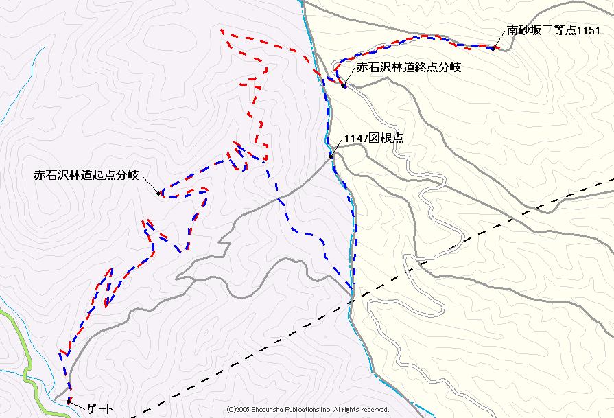 1090m地点が峠のようになり、南北に道が横切る。これは剣の峰山の旧登山道であり、地形図にも描かれている。ただし今は、この場所から北へも南へも、規制線テープが張られていた。そしてなにか大きな標識があったようで、2本の支柱が残る場所が、4か所見られた。この先で、進む先にめざす南砂坂三等点峰らしき高みが見えてくる。手前に鉄塔が確認できるので間違いない。緩く下って行くと分岐が現れ、ここが赤石沢作業道の終点で白い標柱が立っている。見える目標点からは、東に進みたくなるが、ここは左折して西に進む。途中には20畳ほどの池が西側に見られる。林道下の配管が詰まってしまっているようでもあった。池を左に見たら東進に変わる。