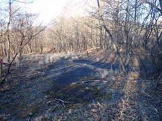 | 1000m付近。流れが覆い凍っている。 | 1090m付近1147高点峰北側の峠。 | 北側へ進む林道幅。 | 1147高点峰へ進む道形。 |