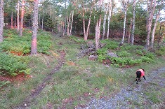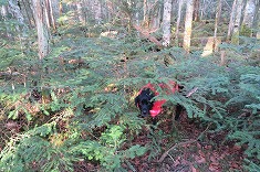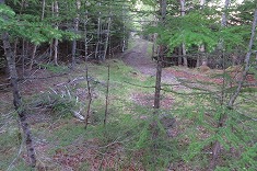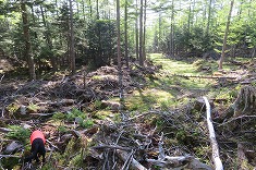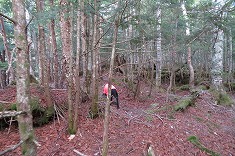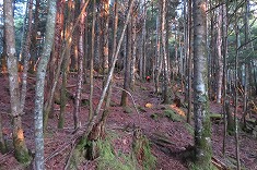 | D1865m付近で林道幅は消滅。終点からの斜面は倒木が多い。 | 1880m付近。下草がなく歩き易い。 | 1920m付近。道形が現れる。鹿道のよう。 | 2000m付近 |