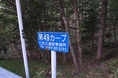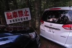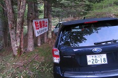 | @標高1840m地点の駐車余地。20台ほど停められそうな広さ。 | A白駒林道入口。駐車禁止表示前に3台。 | A49号カーブの場所。 | A駐車禁止表示の真ん前に。この先に山小屋を持つ、上智大学の関係者か・・・。 |