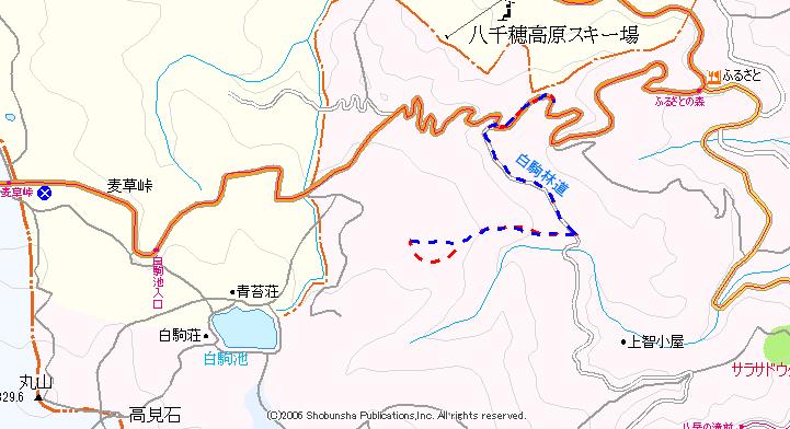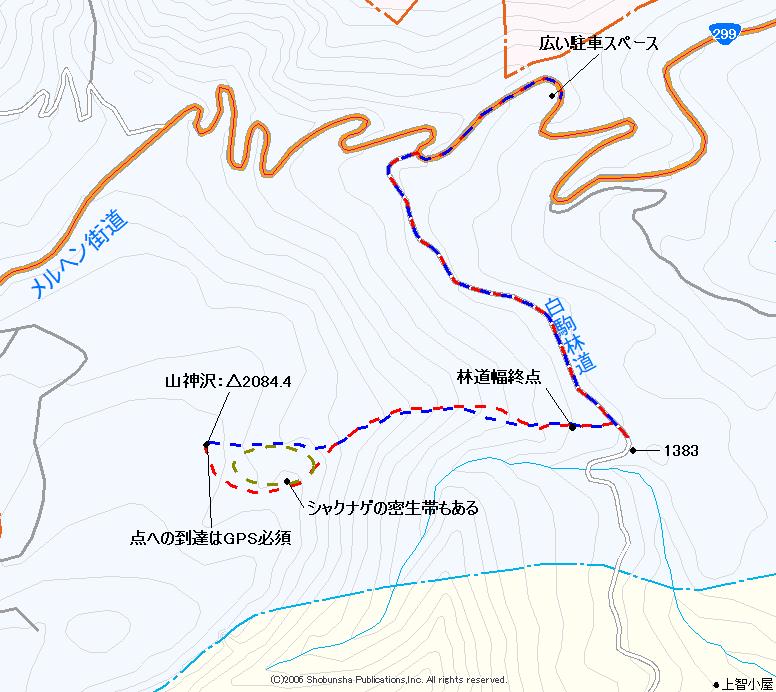 さてルートを計画する。白駒池側の白駒第二支線林道を使うのが最楽のようだが、白駒池が「犬禁」であり、西からの行動は封印する。あとは南からは無いので、北か東からとなる。北に白駒支線林道が在り、そのゲートの道向かいから山道があることを知った。林野庁の「千曲川上流森林計画区」と言う図面からなのだが、目指す山神沢の、東150m付近を通過し南に通じている。使えるなら都合がいい。現地は笹だろうから、描かれている道形が使えるのかどうかが不明。駐車場所は白駒支線林道ゲート前に広く余地がある。