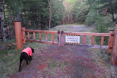 ゲートから3分ほどで、南西に斜上してゆく枝林道が見られる。向かう先は山神沢方向なのでそそられるが、右に見ながら通過する。この辺りからの西側斜面は大岩がゴロゴロしており取付くことは出来ない。こんな場所が続いている斜面だったら撤退である。さらに5分ほど進むと、今度は南東側から林道幅が上がってきていた。東の空から来光があり、上州側は夕焼けのような赤い空になっていた。目を林道に戻すと、その林道からニョキっと棒が出ており、某先には赤いマーキングがされていた。近づくと、直径350mmほど、深さ300mmほどの穴が開いていた。地形が抜け落ちたような感じで、周囲地形に余裕があればいいが、この場所は林道幅しか通過できない場所で、この穴のために四輪は通過できない。軽トラでも避けて通過できないだろうと見えた。林道の様子、入り口に置かれた車、今現在は、白駒林道を通行できないのだった。