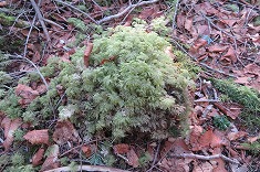 | E山神沢三角点のある広大な斜面。 | E分けながら探したり、GPSに頼るも測位誤差もあり、なかなか見つからず。 | E途中で諦め、先に焼きそばパンを。 | Eやっと見つけた。目視で見つけようと思っても無理。足が見つけた点。コケの厚さは80mmほどになっていた。 |
