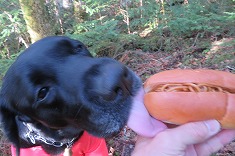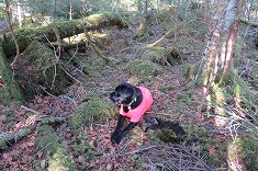 迷犬が不思議そうに飼い主を見ていた。同じようなところを何度も歩き、行ったり来たり。それらしい場所の土を蹴り、人工物が無いか探しているのだが、20分ほどがすぐに経過してしまった。探し出せていないが、先にヤキソバパンを出し迷犬と分かち合う。諦めも少しあったのだが、ヤキソバパンをエネルギーに再び捜索に入る。懸柱は絶対にないだろう事が判った。その理由は湿気過多。あとは、防障石が頼り。標石1つより、4つの周囲のそれらを見つける可能性の方が高い。地面を掘るようにあちこちの土を蹴る。イノシシになったような気分だが、点の記にあるように一帯に岩が多く、何度も自然石を蹴り、ぬか喜びをしながら探し回る。倒木も多く、その下になっているのか、針葉樹の落ち葉で地面下深くになってしまっているのか・・・。
