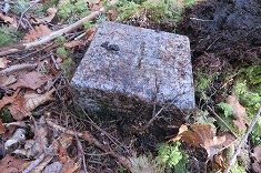 | Eコケを退かすと綺麗な標石が現れた。 | E三等点。欠損なし。 | E三角点(右)と | E点の北東のシラビソに絶縁テープを巻いておいたが、この場所を見出すまで大変。 |