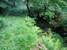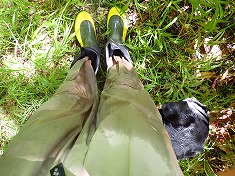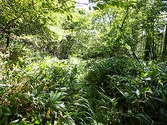 | びしょ濡れ。 | 往路で引き返した場所。笹が終わり草地に。 | ※ 林道に入ってすぐの笹の密薮。ここで負荷に感じたら林道に入らない方がいい。頭丈。 | E林道の出口。駐車スペースは十分量。 |