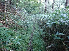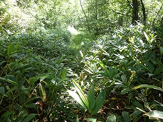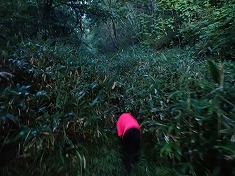 4:47林道入口から入山。すぐに地形図通りに右カーブし北進となる。ここで林道幅は笹の密生藪となる。距離は8mほどだが、背丈以上のササが編まれたように絡み合い、分け進むにも苦痛で、ここの通過で全身濡れ鼠になった。判っていれば雨具を着たのだが・・・。もし、ここの藪が負担に思えたら、この先には進まない方がいい。先に書いておくが、藪を本職にしている薮ヤ向きな植生が続くことになる。