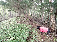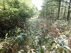 | D周囲は腰丈の笹薮。 | 林道上に古い道標。破線の場所より北に立っていた。 | 林道を北進し1685m付近。肩丈の笹薮。 | 1680m付近。胸丈。 |