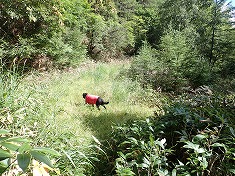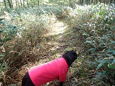 1620m付近で笹の植生が弱まり、以東はゴーロ地形で、足場のよさそうな1625m付近で林道を離れる。岩の上を乗り進むのは、迷犬は苦手で歩き辛そうにしていた。こんな地形で登れれば人間様は楽であるが、そう甘くはなかった。1680m付近で尾根上に乗った形となったが、一面の笹原であった。まあこのあたりは「点の記」に書かれている通りとも言える。この辺りはまだ、空間を選びながら分けられたが、1700m付近からは密生藪となり、いやなことに東側を向いて笹が倒れていた。そして倒れている枯れたササが500mmほど堆積している場所が続く。
