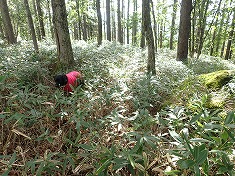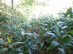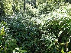 | 八柱沢右俣の左岸に、作業道が在ったような雰囲気。 | 1625m付近で笹の植生が無くなり、斜面に取りつき尾根を目指す。 | 1680m付近。尾根上に居る。胸丈くらいの笹。 | 1740m付近。下側に倒れた笹が膝丈くらいまで堆積しており、分け進むにも腿上げが伴う。 |