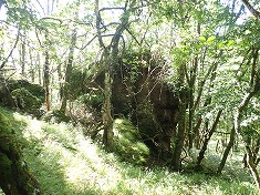 | 1730m付近。林道上は沢のようになっていた。200mほど。 | 1720m付近の大岩 | 1725m付近の奇岩。三つ子岩な感じ。 | 尾根末端から1736.1高点を目指す。 |