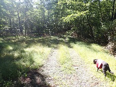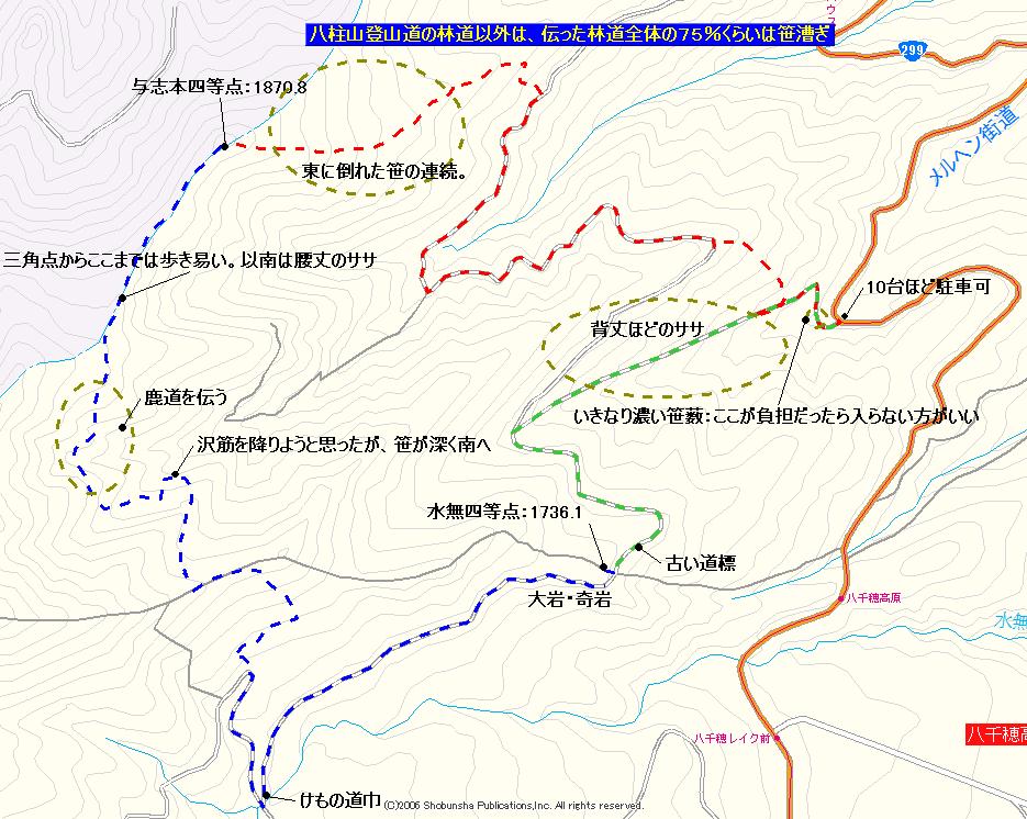 ショートカットを終え1650mの林道上の乗る。林道に笹の植生は無かったが、進む側の西側を見ると、見事に林道をササが覆っていた。林道を獣も使っているようで、笹藪の中には一本の獣道が走っていた。分けて進むとオアシスのような草地があり、そこで少しインターバルをとると、再び笹の植生となった。林道はこの繰り返しだった。1635m付近には、2トンほどありそうな大きな落石が林道上にあった。1638m付近には、幅750mm高さ600mmくらいの間口の、獣が住んでいそうな岩穴が見られた。そして八柱沢に向かって直線的な道となると、かなり濃く獣道が見られた。