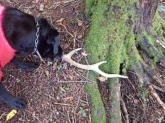 1835mで八柱沢の左俣上流部の中に入った。下草の無い歩きやすい場所が少しあったが、下側はこれまで以上に笹が密生していた。ここで、小尾根を南西に登って八柱山に行こうかとも考えたが、南に向かう鹿道があり伝ってみる。南に進み、登山道のある尾根の一つ北の尾根に登って行くと、立派な鹿の角が落ちており、目ざとく迷犬が見つけた。自分で咥えて持ち帰ろうとしていたが、さすがに突起量が大きくザックに縛り付ける。この尾根からは獣道が消え、そのままササ漕ぎをして南に分け進むと、再び獣道が現れた。伝い進むと、1875m付近で八柱山の登山道に乗った。ササ漕ぎ行脚もここで終了と思いたかったが、そう甘くはなかった。