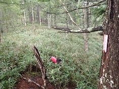 南西側に降りて行く。ひざ丈のササでほとんど負荷がない。登り勾配になる最初が急登で、以降はなだらかになる。境界標柱が埋められ、見出し標と共に続いていた。獣道が続き、それを追いながら1865m付近まで行くと、その先は胸丈の笹藪が待っていた。獣道は尾根の北側を進んでいるものと、東側を進んでいるものが見られた。後者を選び伝ってゆく。これは真南に向かう形で進み、途中の流れのある場所で途絶えていた。背丈以上のササの植生の中、より楽を選び沢筋に下降することにした。