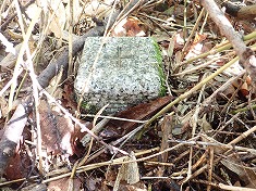 | 林業用のマーキングが見られる。 | D水無三角点の大地に乗る。 | D発見!! 顔を出していてくれて助かった。探すこと3分。 | D水無四等点。無傷。 |