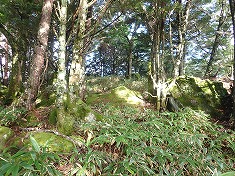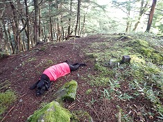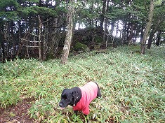 逃げようにも逃げられず。帰ろうかとも思うのだが、もうニンジンをぶら下げられたような距離となり、頑張れば到達できそうだった。さすがの四駆の迷犬も進度が落ち後ろを歩くようになった。藪の中に潜る場所がなく、跨ぎ乗り越え分け進まねばならないのだった。ちょっと連れてきたことを可哀そうに思ったが、もうすぐ目標点と手と足は動かし続ける。濡れ鼠の衣服に、笹についている白い粉のようなものが付着する。植物性なのか、虫のよるものなのか判らないでいる。汚れなど、もうどうでもよかった。向かう先の空が青く見えてきた。もうすぐ。山頂部は黒く見え、岩頭な形状のように見えていた。直下で笹の植生は終わり、見えた通り山頂は露岩の折り重なった場所であった。