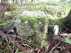 1720m付近。林道の南側に大岩があった。さらに1725m付近には昔のアディダスの葉っぱのロゴのような三つ子岩が見られる。これもけっこう大きなものであった。その先で林道が尾根を乗越す場所があり、ここから尾根に取付く。破線路の場所はもう少し北側だが、先ほどの分岐点を見ているので、道形などもう無いのは判っている。取りつきから4分ほどで水無三角点の大地に乗り標石の探索に入る。あちこちと歩き回ること2分。笹藪の中に標石の天面を発見した。