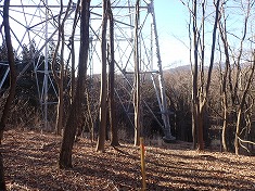 階段路を降りて行くと、先ほどの分岐点から4分ほどで20号鉄塔の場所となる。19番は紅白に塗られていたが、こちらはドブ付けメッキ仕様であった。鉄塔下からは、たぶん巡視路は東に切られていたようだが、ここは適当に南に下る。すると下に林道が見えてきた。ちょうどカーブミラーの場所で林道に降り立つ。伝って降りて行くと、往路に林道から離れた場所に戻った。ここで逆回りだったらどうだろうと思ったのだが、たぶんその場合は、あの藤蔓を見ることはできなかったと思えた。あれが見られたことで、今回の進路で良かったと思えた。