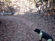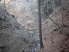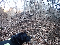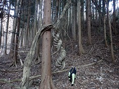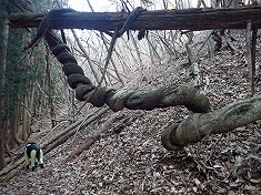 沢の左岸斜面には杣道と言えよう薄い道形が在り拾いながら登って行く。時折見失うが、何となく進むとその先に繋がっていた。こんな様子なので、現在は全く使われていないようだった。しかし進んで行くと驚く出迎えがあった。まず735m付近に、直径300mmほどになった竜のような藤蔓が見られた。さらに760m付近、770m付近にも特異な形の藤蔓があり、その奇形さに目を楽しませてもらった。道形は780m付近で見えなくなった。進む先に二股が見える。沢の中に降り凍った上を伝って行き股の場所となる。迷犬は凍った上は苦手なようで歩き辛そうにしていた。頻繁に爪切りをしているので爪が立てられないのだった。ここで沢伝いは止め中央の尾根を登ることにした。