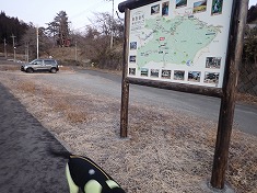 5時に家を出る。この時はマイナス7℃。現地入りするとマイナス12℃まで下がっていた。欲張って標高の高いところで計画しなくてよかった。地形図に読める614高点の場所に広い余地があり、気兼ねなく停めることができる。川原湯側に向かう観光客用の絵図がある場所で、公的に用意された駐車余地のようだった。外に出るとさすがに冷える。グローブの耐寒温度が気になった。里山と思って低い温度のモノしか用意してこなかったのだった。