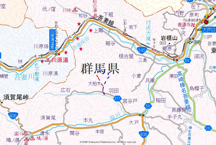 麓にある大柏木諏訪神社に立ち寄る。距離こそ短いが、参道両側に立派なスギの大木が並ぶ。そして点灯している御神灯を左右に見ると境内で、そこに立つ社や舞台は、とてもきれいに保たれていた。そうそう、ここは神社となっているが狛犬の姿は無い。蔵もあり、山村らしい地域の鎮守な位置取りの造りであった。社の北東にはご神木も見られた。無事の下山をお参りして麓に降りて行く。大戸と川原湯を結ぶ道は往来する車両は多い。その音以外は全くしない村落で、道ができる以前は本当に静かな場所だったろうと思えた。