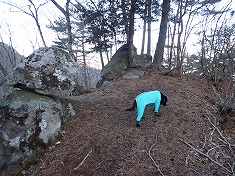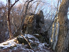 1010m付近で北西尾根に乗る。乗った先の広葉樹に熊だなが見られた。少し戻る様に西側に進んでみる。下側から見上げた時に、奇岩に見えた場所があるからだった。その岩に着くと、大岩の上に大岩が乗っているような、ダルマが上に乗っているような岩だった。さらに西側に進むと、浅間山側の展望地があった。南東に尾根を伝って行く。1040m付近には熊の糞が見られた。