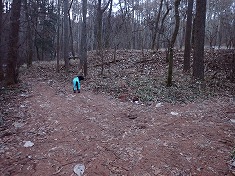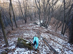桐ノ木四等点の場所は、”天狗の露地”とでも言えよう、アカマツの生える場所で、北側には赤松の大木もあった。この肩地形中央に四角い平たい露岩があり、そこに金属標が打たれていた。ここには標識は無かった。予定の2座を終了し、そのまま尾根を北に降りて行く。里山なので、こんな尾根にも道形が在ってもいいようだが、ここには見られなかった。そして下側に行くほどに尾根が広まり、幼木を避けながら適当に降りて行く。