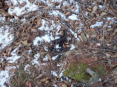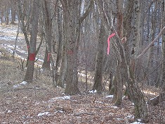 そのまま南西進して、佐久市と御代田町との市町界尾根に乗る。この尾根上には、赤ペンキとピンクのマーキングがこれでもかと付いていた。それらを追いながら西に進むと、尾根の南に林道幅が現れた。これは平尾富士側からの林道で間違いないだろう。残雪には二人分のトレースが見られ、東進していた。1110m付近には広みがあり、ここは林道を斜めに横切る古い山道があるようで、変則四差路のようだった。さらに西進し、林班の杭番号88の場所から1095高点側への尾根に入る。市町界尾根からの地形はやや広く、東側にも北に下る尾根があるので注意したい。と言うのも一度間違えてしまい、下りだしたら西に顕著な尾根が見えたので修正したのだった。